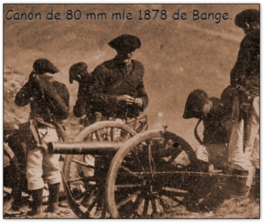 |  Artillerie de montagne. | Rôle : En raison des terrains dans lequel elle doit se déplacer, l'artillerie de montagne doit être avant tout légère et peu encombrante. Le poids est déterminé par la charge maximale que peut porter un mulet, environ 150 kg. Pour obtenir cela on a dû étudier des canons démontables dont les éléments sont répartis sur plusieurs mulets. Matériels utilisés : On commence à équiper les bataillons de chasseurs à pied avec le canon de 4 rayé, qui a déjà fait ses preuves dans les colonies. Le colonel de Bange nous offre le dernier rejeton de son système avec le 80 mm de montagne. Puis les bataillons de chasseurs alpins sont équipés du canon de 65 mm à tir rapide équivalent du fameux 75. | Armement des batteries de montagne.