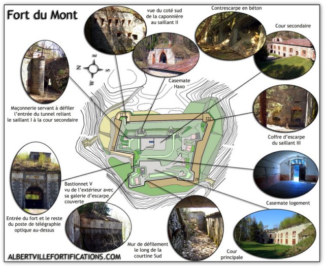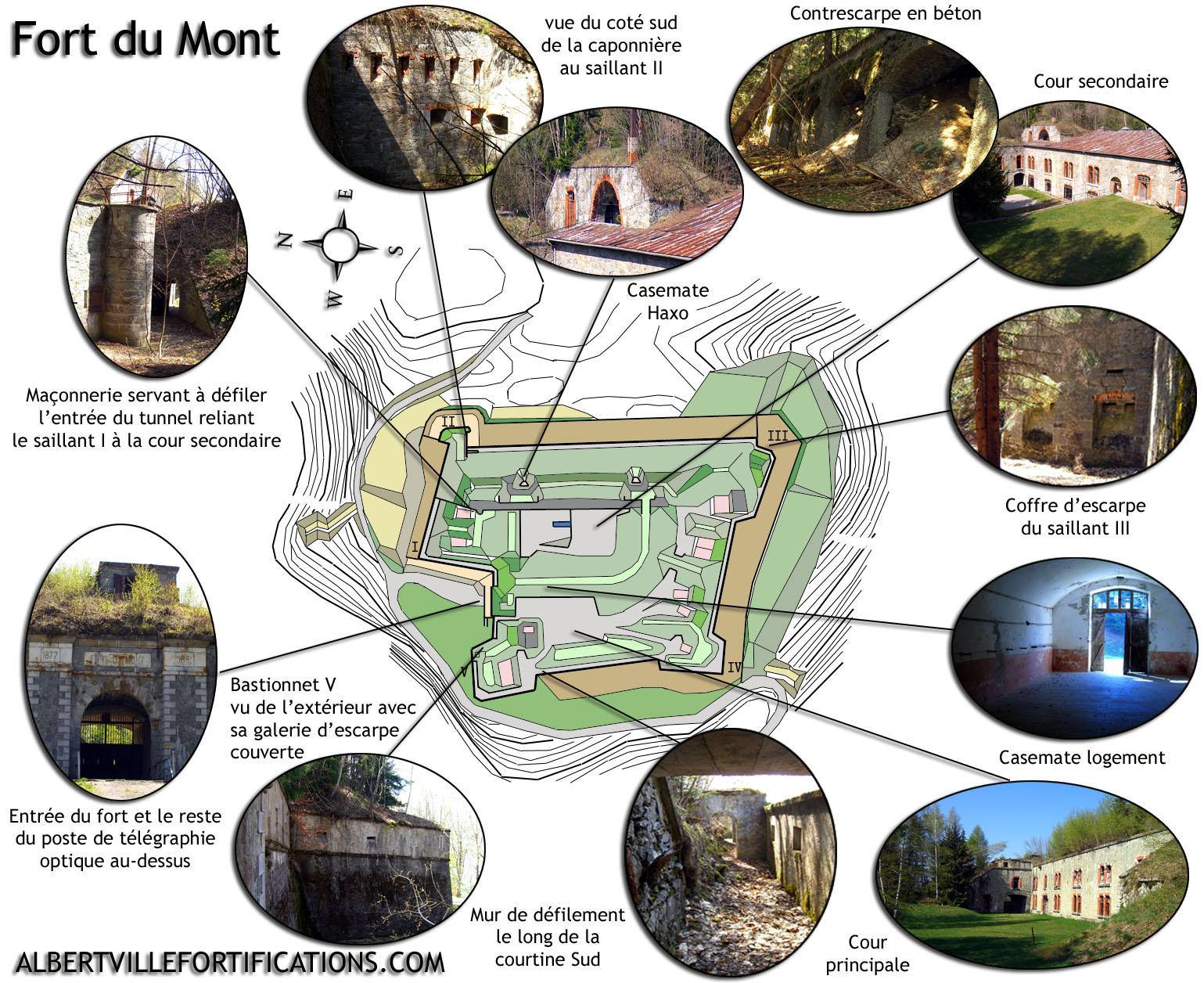 |  Fort du Mont. | Le fort du Mont a un tracé un peu moins conventionnel que Lestal, ressemblant plus à un carré qu'à un pentagone. Sa situation en altitude a obligé ses constructeurs à utiliser des composants de fortification du siècle précédant, plutôt que le système de flanquement type "Séré de Rivières". Aux saillants du fort, on utilise plus souvent les bastionnets que les caponnières si chère au général. En effet, en hiver, l'accumulation de neige dans les fossés, entraverait fortement le dégagement des caponnières et pour le flanquement des fronts il est plus aisé pour les défenseurs de se retrouver sur la plate-forme d'un bastionnet, au-dessus de la neige qu'en bas dans le fossé, avec une vision obstruée par la neige accumulée au cours des longs mois d'hiver savoyard. Autre particularité assez unique pour les forts de la région, c'est la présence sur le front Est de casemates à tir direct, connues aussi sous le nom de son concepteur, casemate Haxo. Elles sont destinées à recevoir de l'artillerie tout en étant protégées des tirs surplombants venant du flanc Ouest de la Roche Pourrie. Système abandonné depuis très longtemps pour les forts de plaine mais rendant de grand service en montagne où on ne craint pas encore l'emploi d'une artillerie puissante. Le fort n'est pas complètement ceinturé par un fossé, malgré le risque d'encerclement. Sur les fronts, Nord, Ouest et Sud, il est pratiquement inexistant, par contre à l'Est, entre le saillant II et III, front hautement exposé, une contrescarpe à voûtes à décharge en béton, borde le fossé, couvert par une caponnière double au saillant II. Un coffre d'escarpe s'occupe de la protection du saillant III. On pénètre dans le fort par le classique pont à bascule en dessous à mouvement assisté en usage dans la Place d'Albertville et on débouche sur une première cour, où se situe le bâtiment des officiers. Par un tunnel à gauche on parvient à la cour secondaire entourée par le bâtiment des sous-officiers et celui des troupes. A côté du bassin on trouve l'accès à l'abri sous roche percé après la crise de l'obus torpille. Il est composé de nombreux magasins où l'on retrouve encore les tôles galvanisées et les gouttières de récupération de la condensation ainsi que les fumivores des créneaux à lampe. Sur le front Sud on retrouve une traverse enracinée, défilée par un merlon maçonné où se trouve de petite niche à munition. |