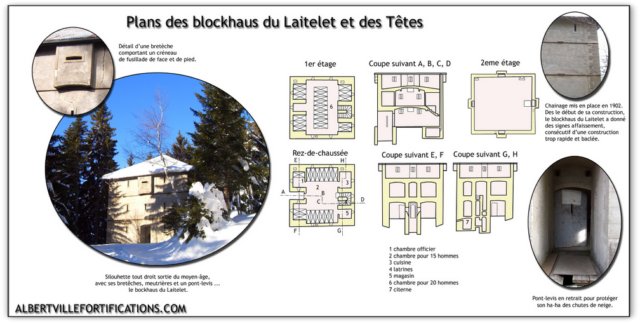 |  Blockhaus du Laitelet et des Têtes. | Ouvrages de surveillance au-dessus du fort du Mont, ces deux blockhaus élevés sur un plan identique, semblent surgir tout droit du moyen-âge. Pourtant, ils répondent à un besoin qui ne différera pas au cours des âges. C'est celui du commandement ! Sur des pentes pour ne pas être surplombé à courte distance, il faut que la construction ait suffisamment de hauteur. Ces tours carrés à trois niveaux, élevées sur les pentes de la Roche Pourrie, possèdent tous les accessoires d'une tour de guet, que l'on pourrait retrouver aux frontières des seigneuries du XV siècles. Bretèches sur chaque face, meurtrières en forme d'archère, pont levis en retrait pour éviter que le fossé ou ha-ha ne se remplisse pas de neige, autonomie assurée par des magasins et une citerne où sont recueillies les eaux de pluie. Ces ouvrages ont été construis pour une fonction bien précise. Les sentiers partant de la vallée de Beaufort et de Tarentaise, conduisent sur des positions qui dominent le fort du Mont. Ces emplacements doivent être surveillés par des blockhaus servant de réduit. Ils sont placés en avant du fort et pourront être parfaitement appuyés par celui-ci et permettre de tenir en respect l'assaillant très longtemps. |