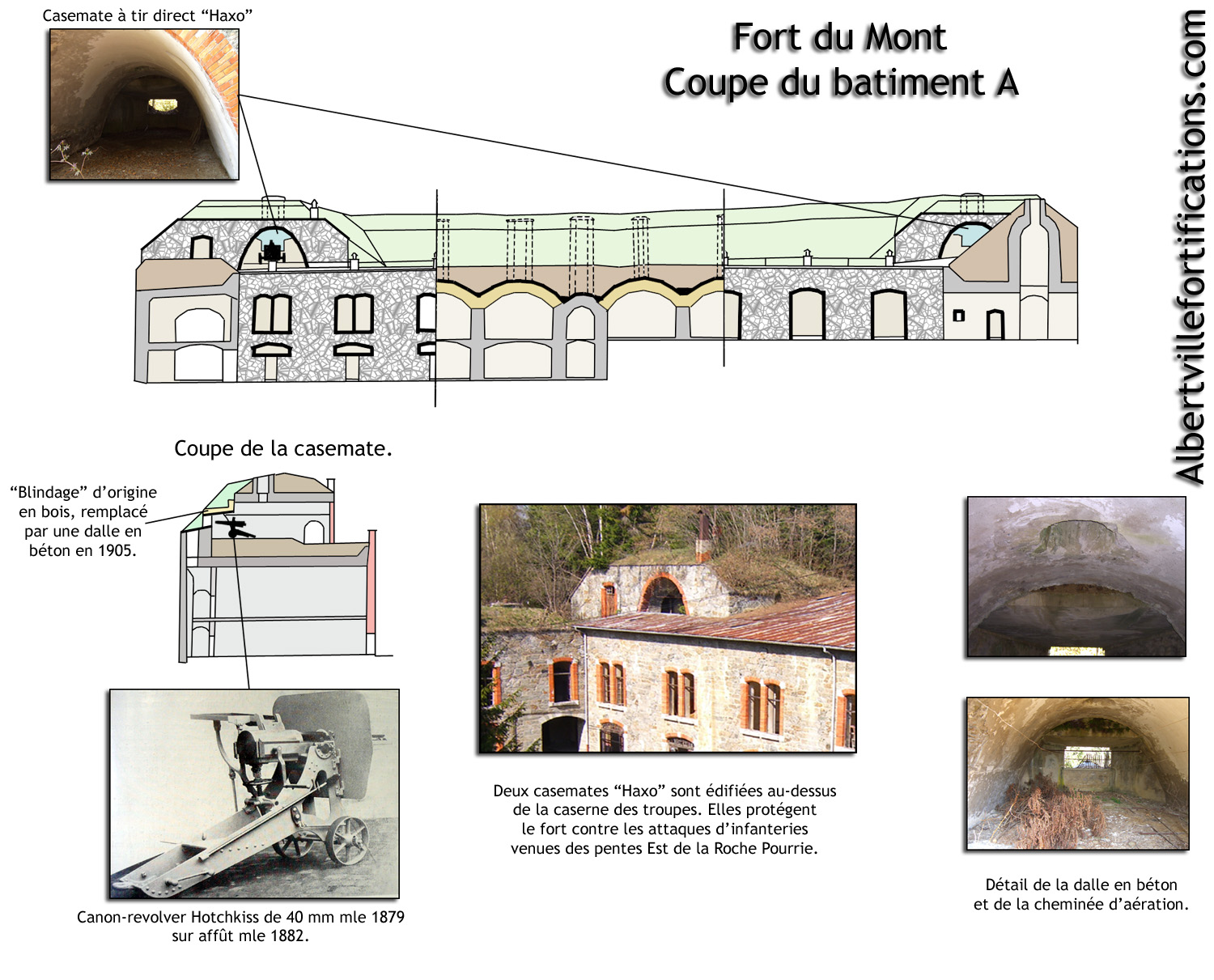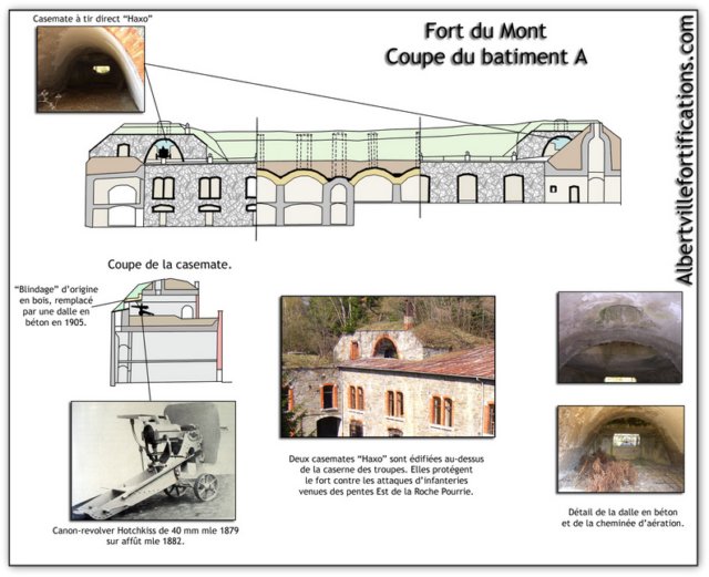 |  Casemate "Haxo" . | Le général Haxo (1774-1838), président du comité de fortification, est l'inventeur de la casemate à tir direct. Le fort du Mont est le seul de la Place, a être équipé de casemates à tirs directs. Elles sont implantées dans le parapet du front II-III. Leurs rôles sont de battre les pentes descendant de la Roche Pourrie vers le fort. Il s'agit de casemates d'artilleries noyées dans le cavalier du fort. Ce sont deux abris en maçonnerie, voûtés, dont on a supprimé le mur à l'arrière pour éviter l'enfumement et fermés à l'avant par un mur destiné à retenir les terres, percé d'une large embrasure. Celle-ci, blindée au départ par de lourdes pièces de bois empilés, seront remplacées en 1905 par une dalle en béton. Elles mettent à l'abris des tirs verticaux et latéraux (tir à ricochet) les pièces d'artilleries qui s'y trouvent. Leur armement composé au départ de pièces de 12 de campagne sera remplacé par le fameux canon-revolver d'Hotchkiss de 40 mm. La protection verticale rend la casemate très intéressante en milieu montagneux, contre les tirs venus de positions dominantes. Il faut se rappeler que les forts sont souvent bâtis sur des replats à mi-pente et donc dominés. Il est très souvent indispensable de protéger les pièces d'artilleries des tirs verticaux. |
