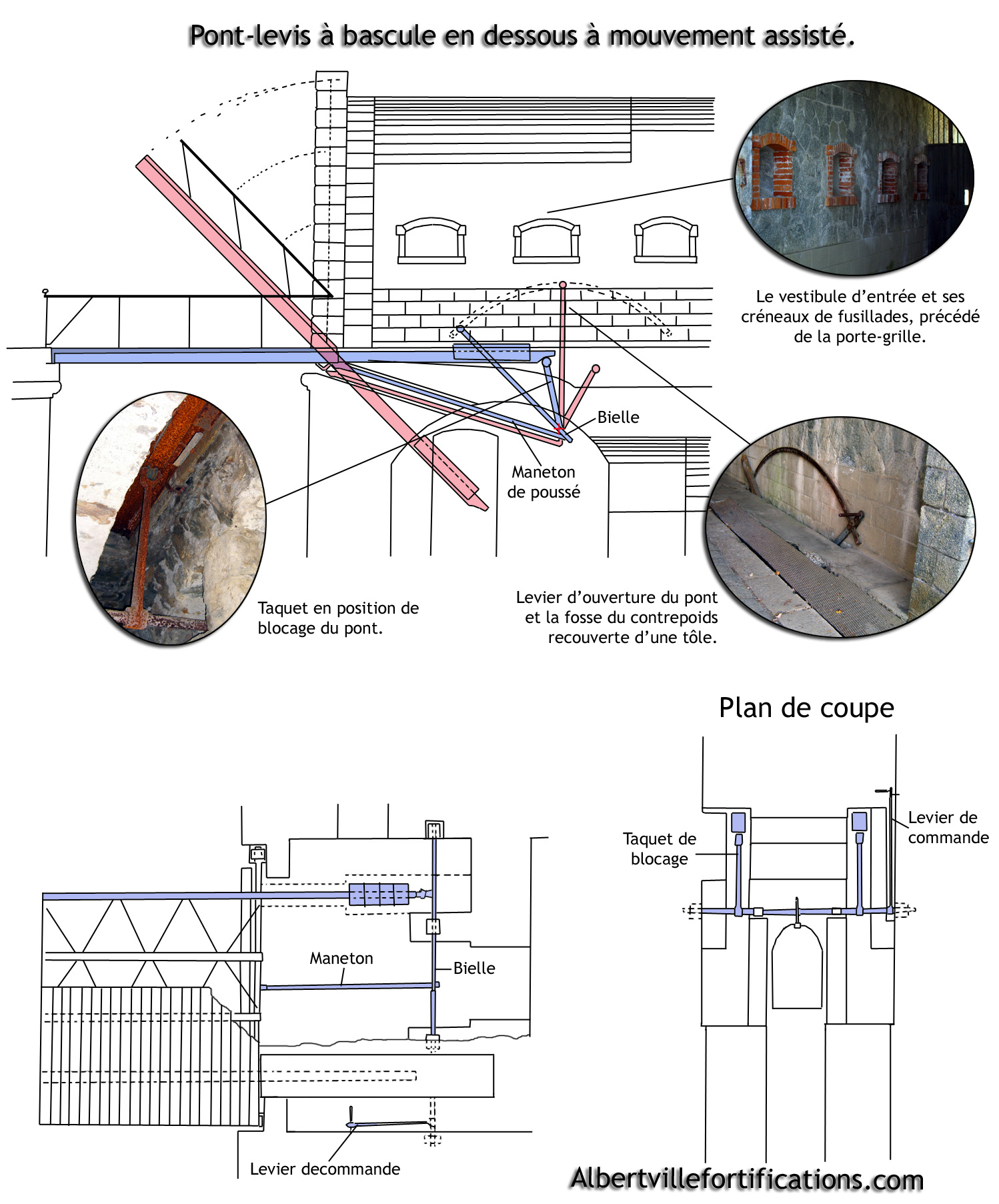 |  Pont-levis à bascule en dessous à mouvement assisté. |  | Ce système avait la préférence de la chefferie d'Albertville. Le levier de manoeuvre est monté dans un guidage semi-circulaire placé dans le vestibule d'entrée. Le pont étant abaissé, en tirant sur le levier de commande, on commence par libérer les taquets de blocages, puis, en continuant le mouvement, on pousse sur le maneton qui aide à lever le pont. |