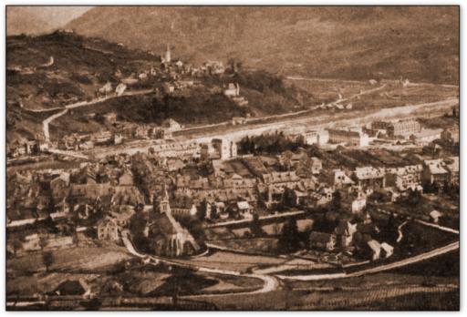 |   | Vue du bourg de l'Hôpital et de son nouveau pont en 1858. |