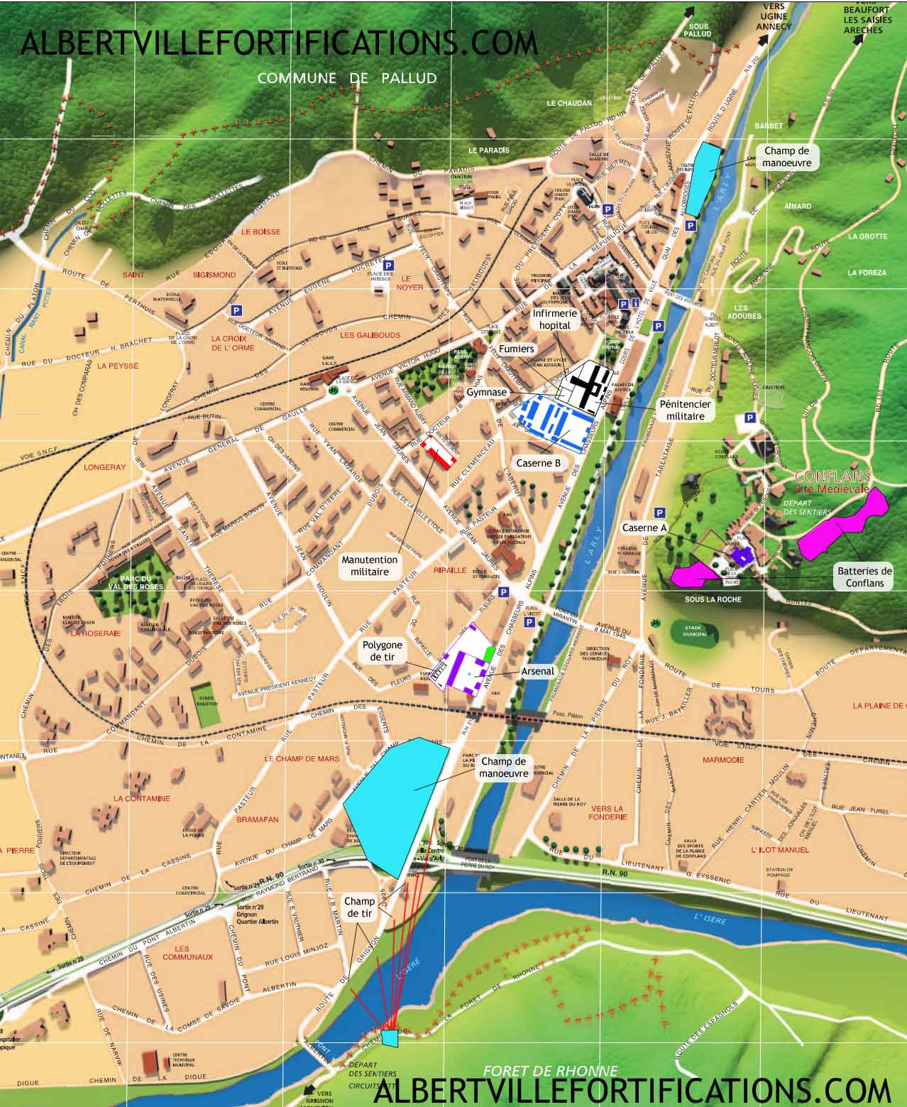 |  Emplacement et rôle des ouvrages défensifs autour de la Place. | Au débouché de la Tarentaise, au confluent de l'Isère et de l'Arly la Place d'Albertville forme un double barrage défensif.